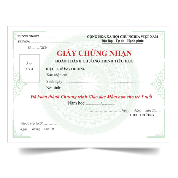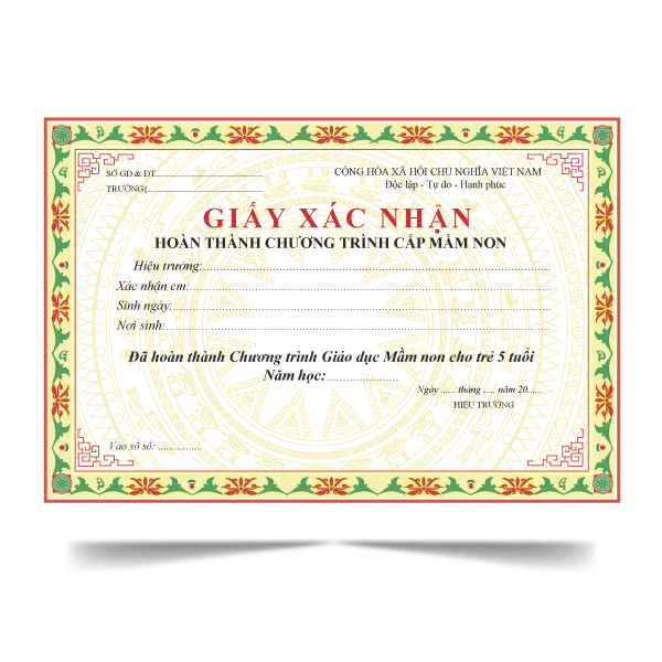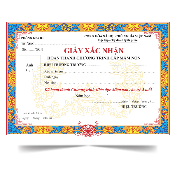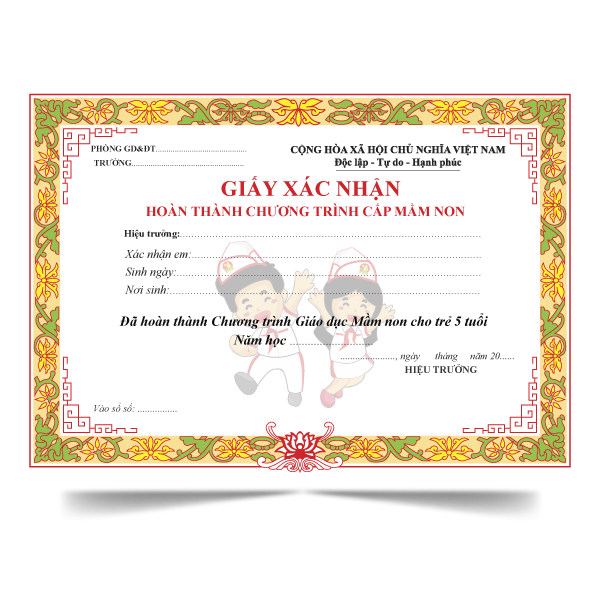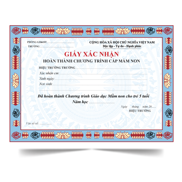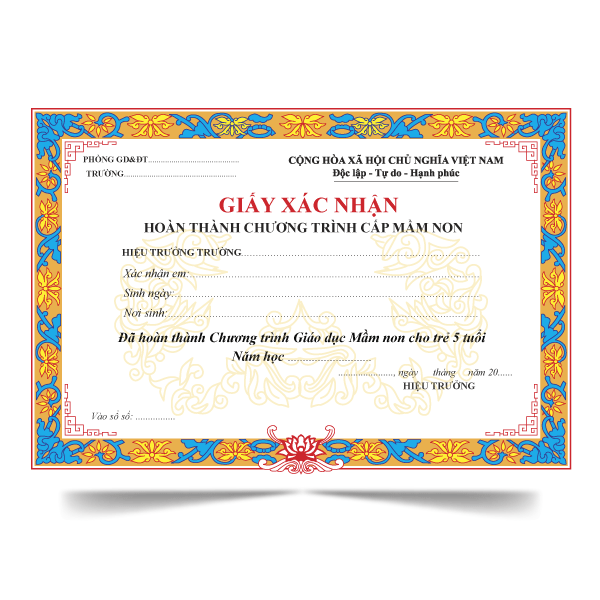 CỘNG HÒA XÃ HỘI CHỦ NGHĨA VIỆT NAM Độc lập - Tự do - Hạnh phúc Phòng giáo dục và đào tạo: Trường:…………………………. GIẤY XÁC NHẬN HOÀN THÀNH CHƯƠNG TRÌNH CẤP MẦM NON HIỆU TRƯỞNG TRƯỜNG ……………………. Xác nhận em: ……………………………………………………………………………….. Sinh ngày: ……………………………………………………………………………………. Nơi sinh: ………………………………………………………………………………………. Đã hoàn thành chương trình mầm non năm học ……………….. ngày…tháng…năm… Vào sổ số: ……………. HIỆU TRƯỜNG